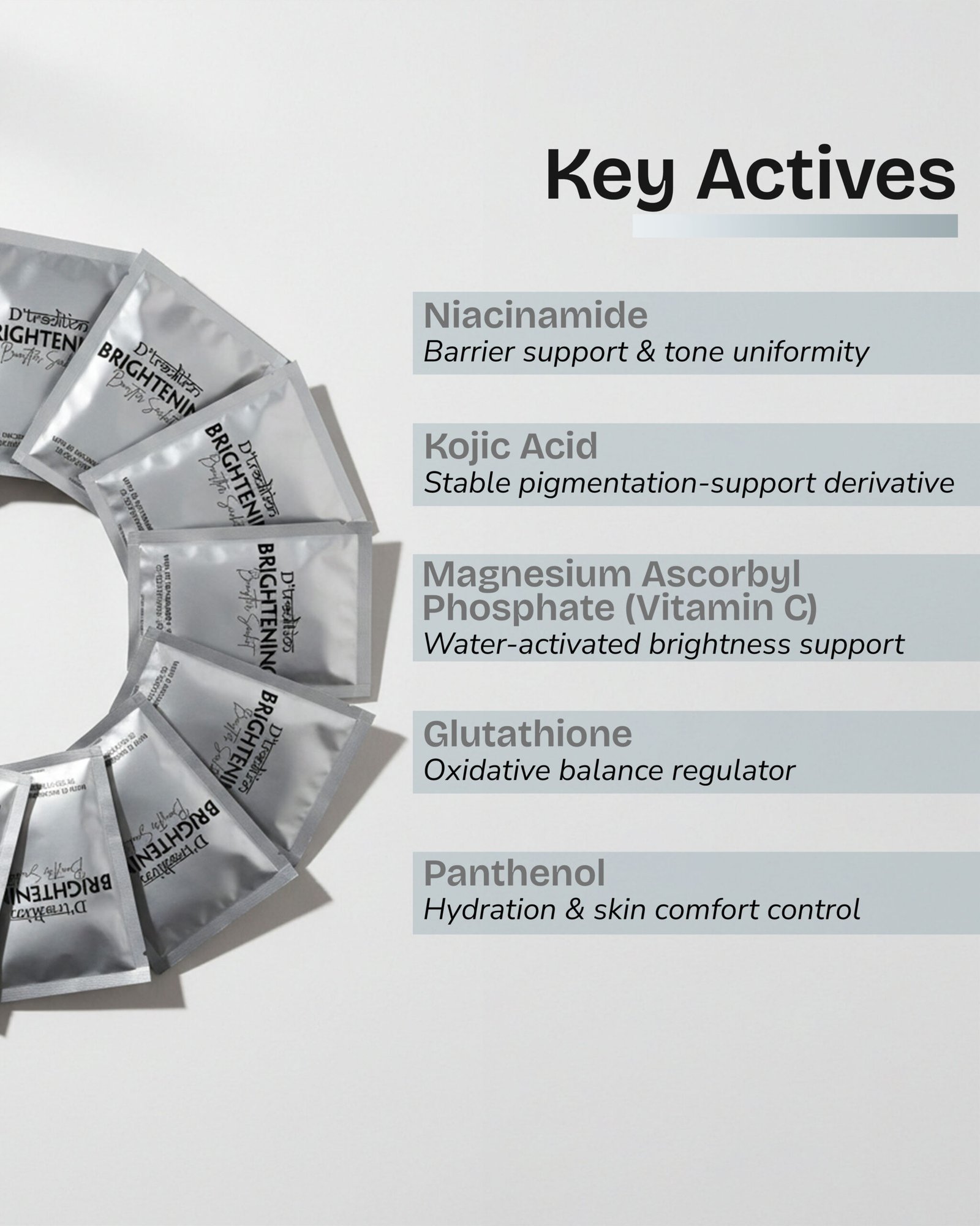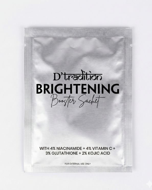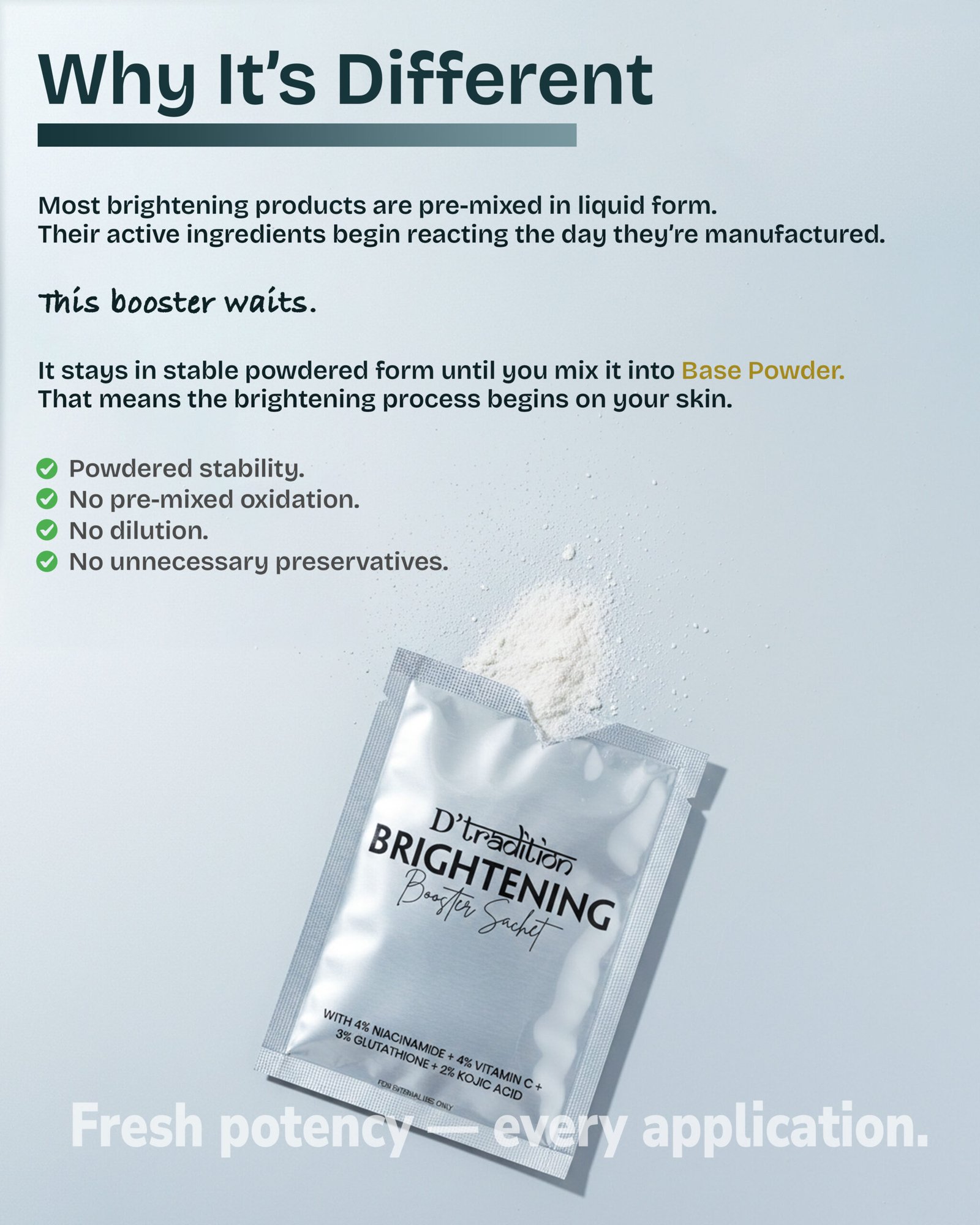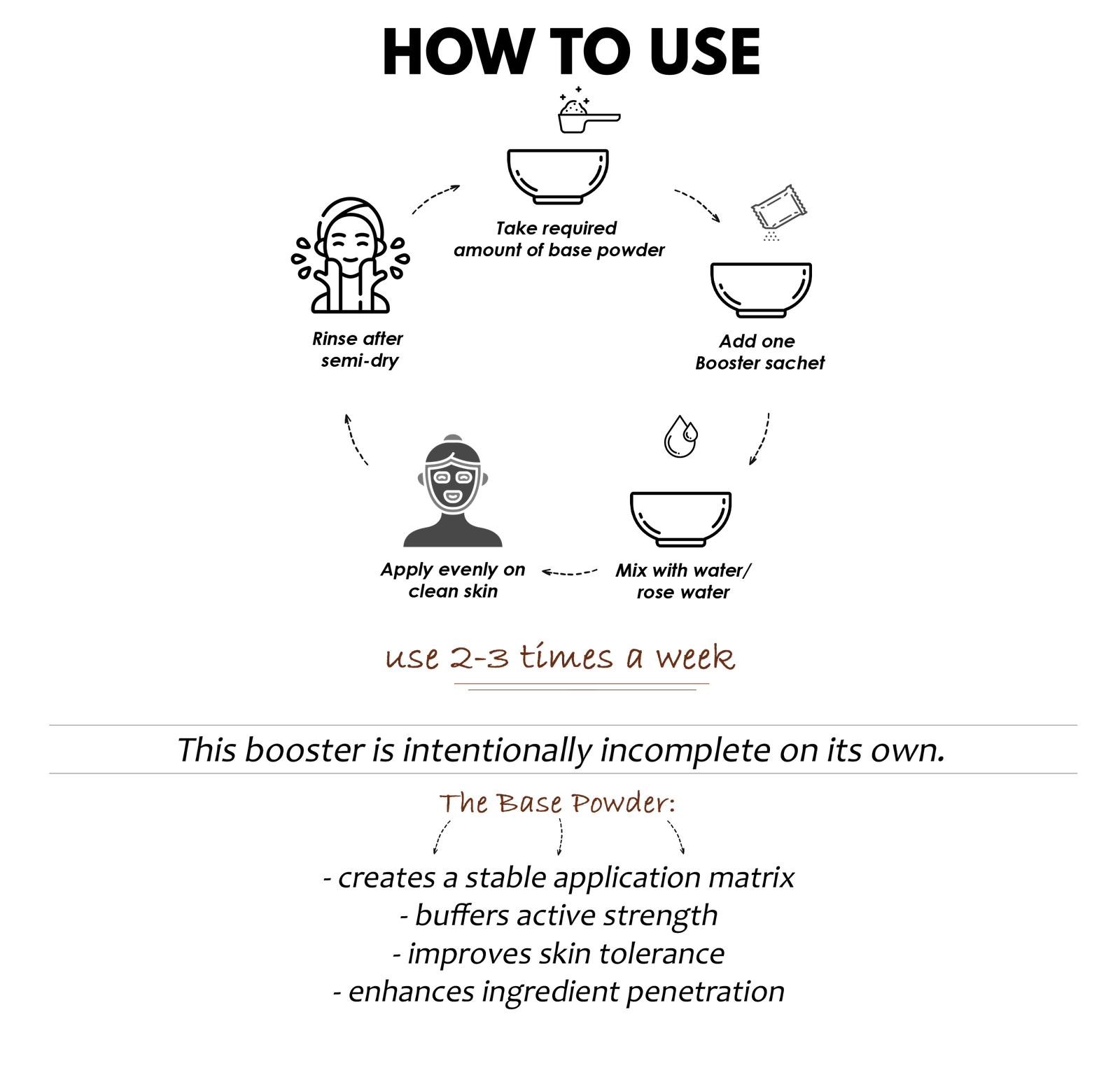 The base powder supports overall skin balance and preparation. Booster sachets deliver high-potency, targeted actives such as Niacinamide, Vitamin C, Kojic Dipalmitate, and Glutathione to address specific concerns more effectively. Together, they form a complete treatment system.