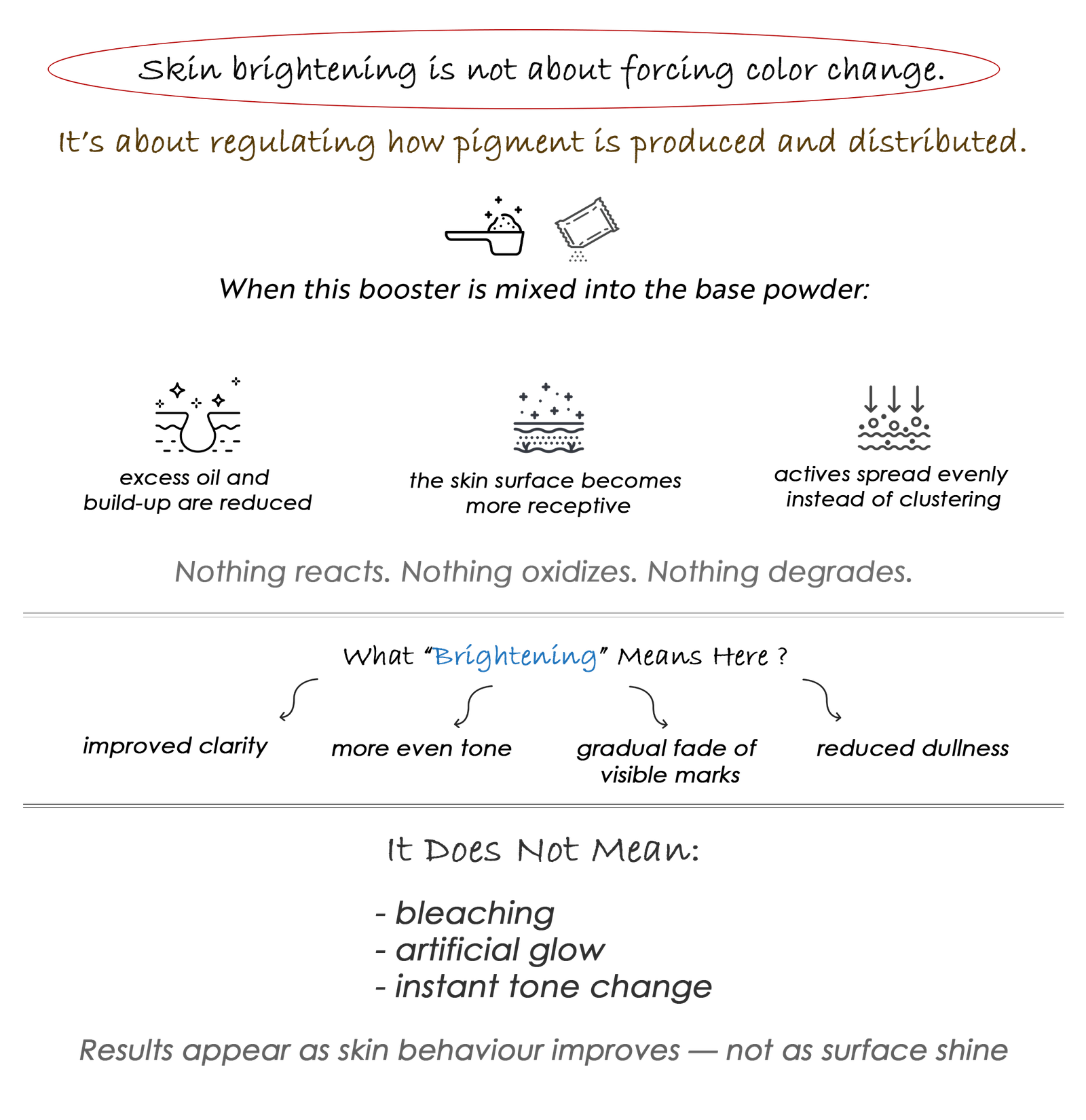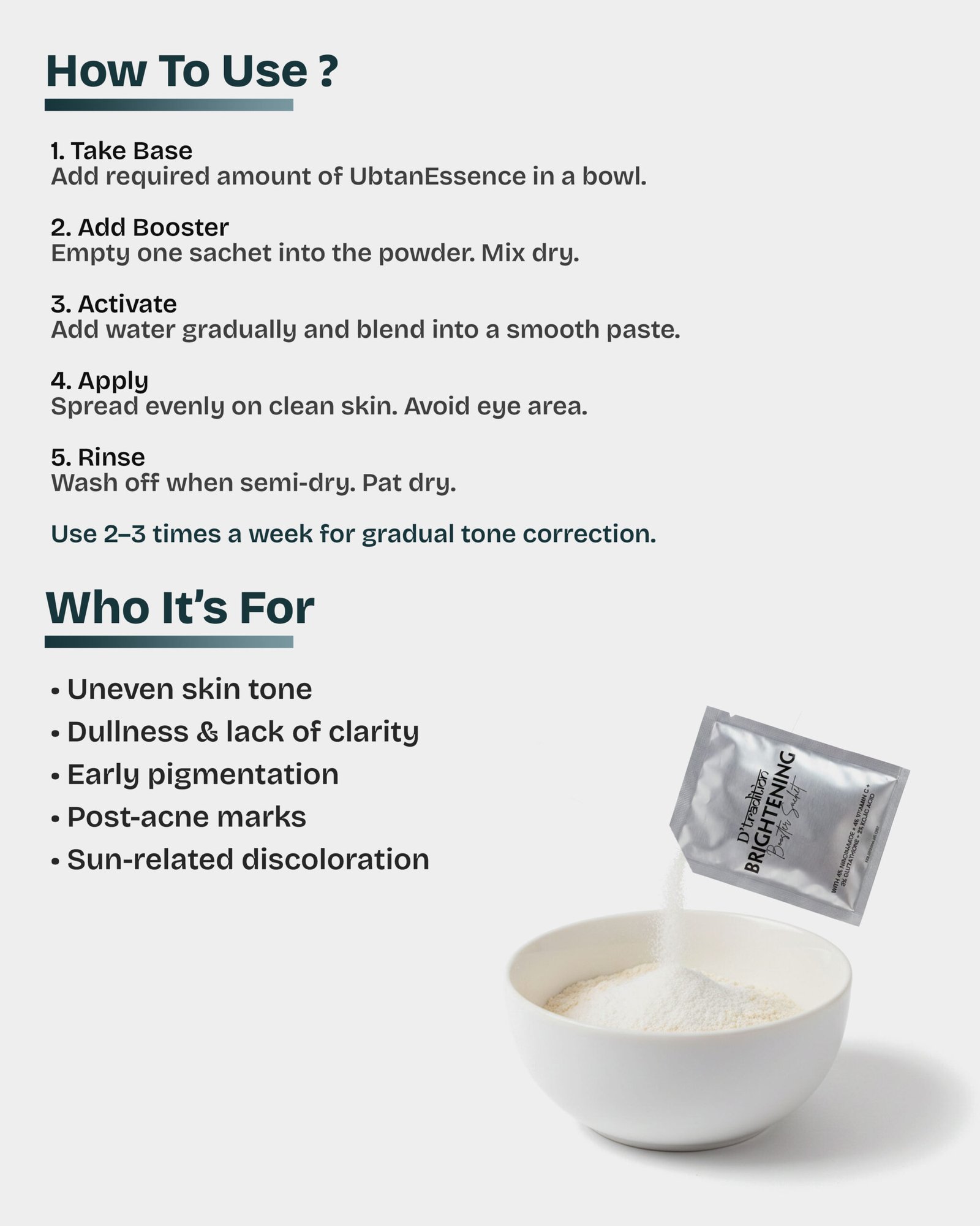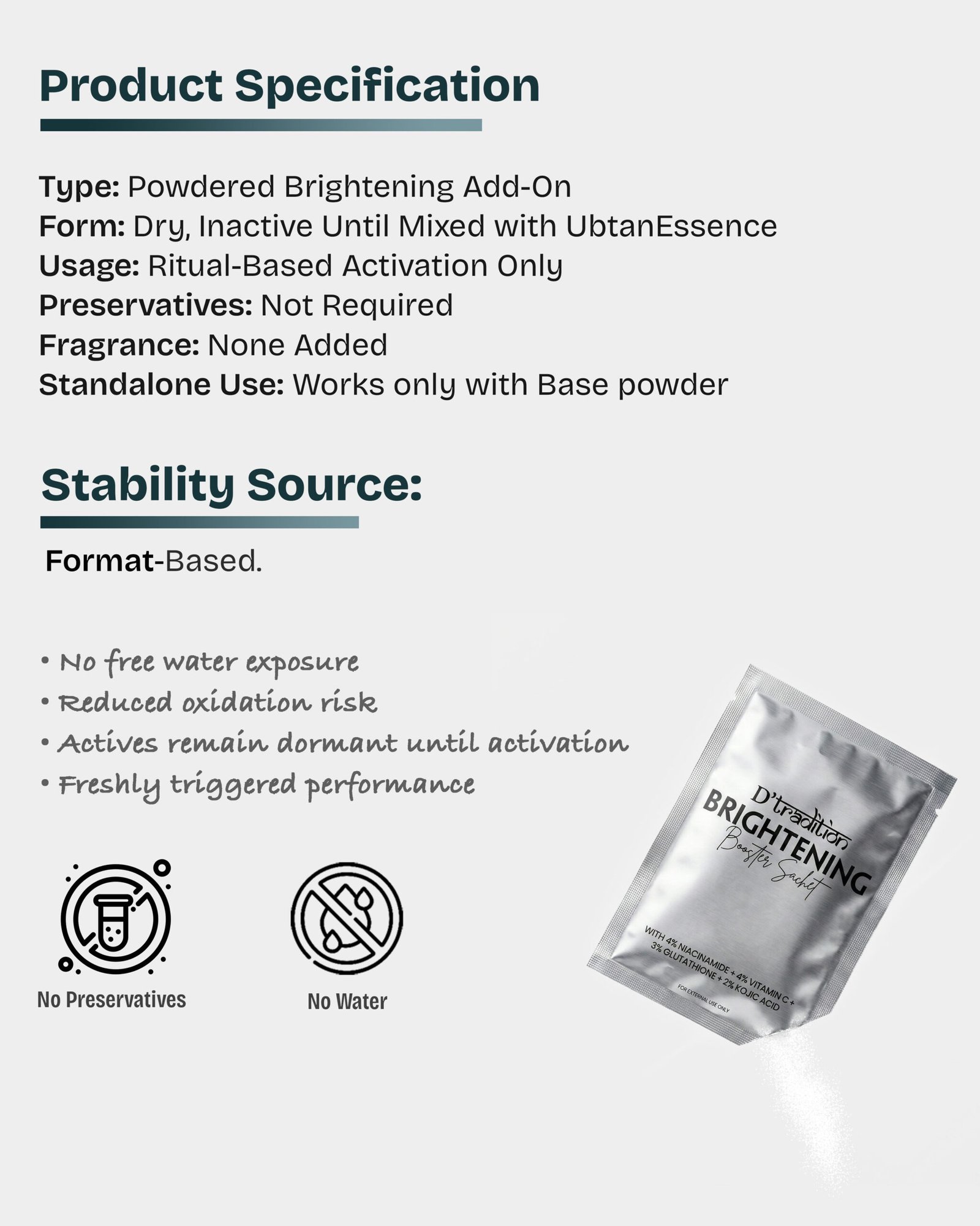 The Brightening Booster sachet is designed to work only when mixed into UbtanEssence. It delivers advanced brightening molecules in their most stable powdered form — remaining chemically inactive until the moment they meet your skin.